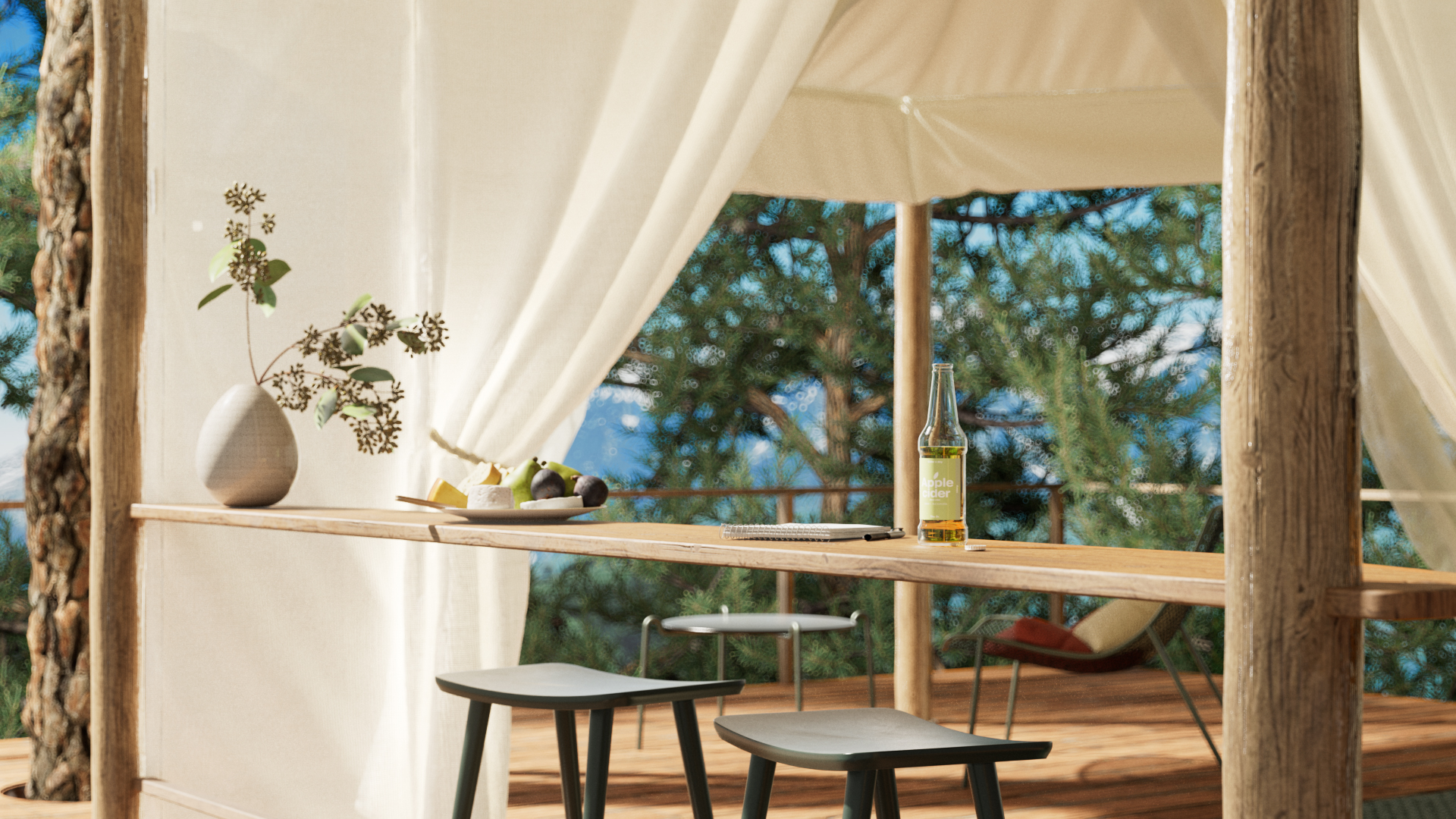 Rugs, picnic table, lantern, gas barbecue, gazebo